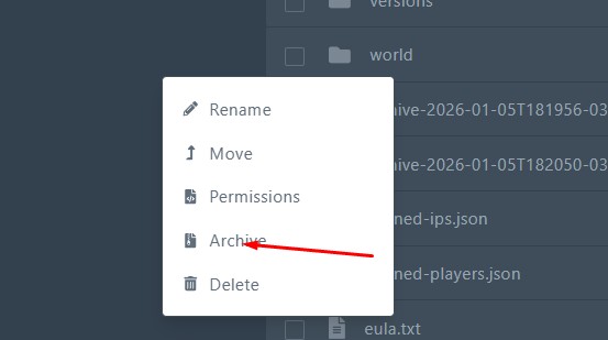 Para comprimir el mapa es muy fácil, solo nos vamos al gestor de archivos y segundo boton del mouse sobre el y pinchamos en Archive, como muestra en la imagen, con esto comprimimos el mapa y es más rapido de descargar.